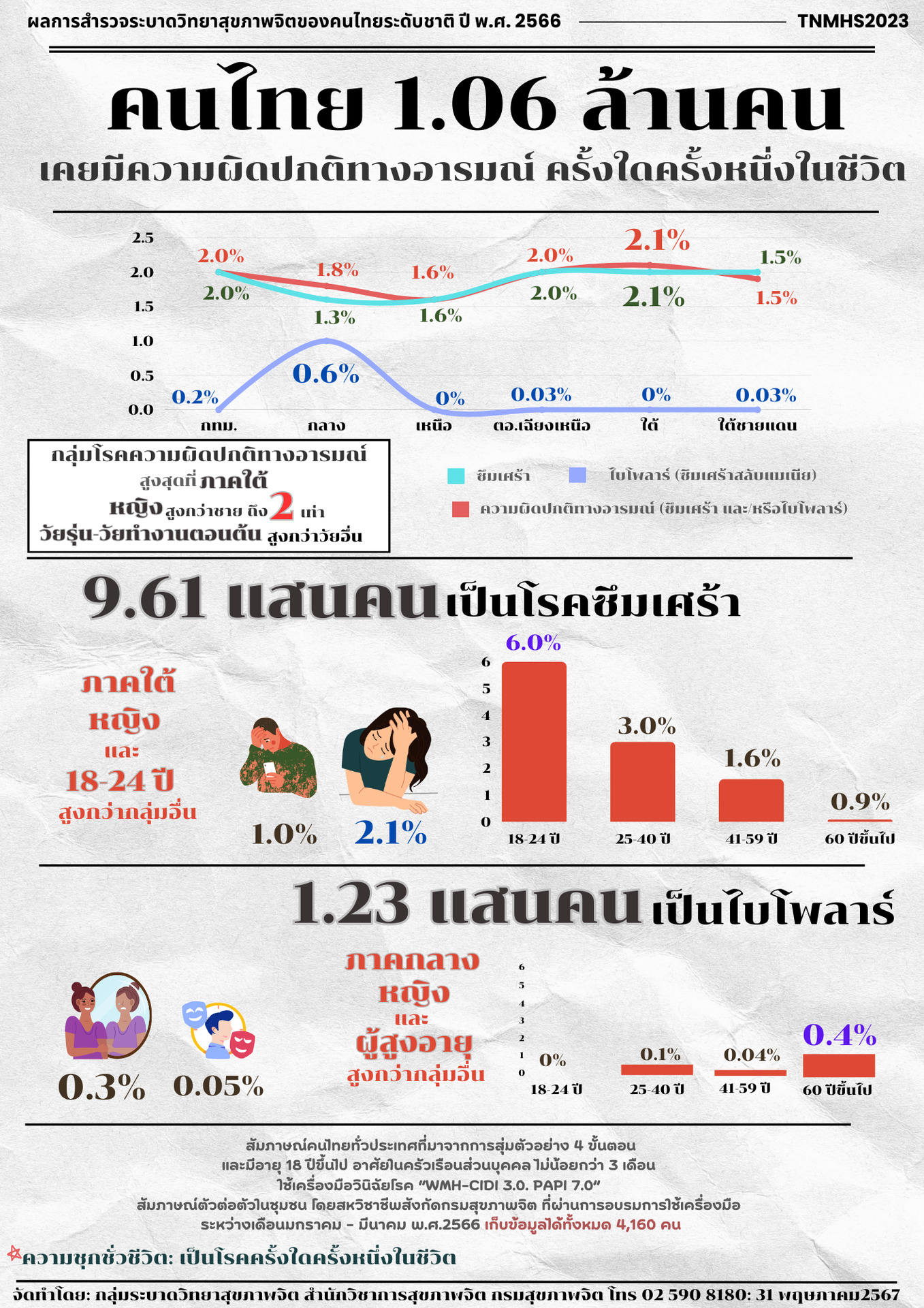 คนไทย 1.06 ล้านคน เคยมีความผิดปกติทางอารมณ์ ครั้งในครั้งหนึ่งในชีวิต : ผลสำรวจระบาดวิทยาสุขภาพจิตคนไทยระดับชาติ ปี 2566