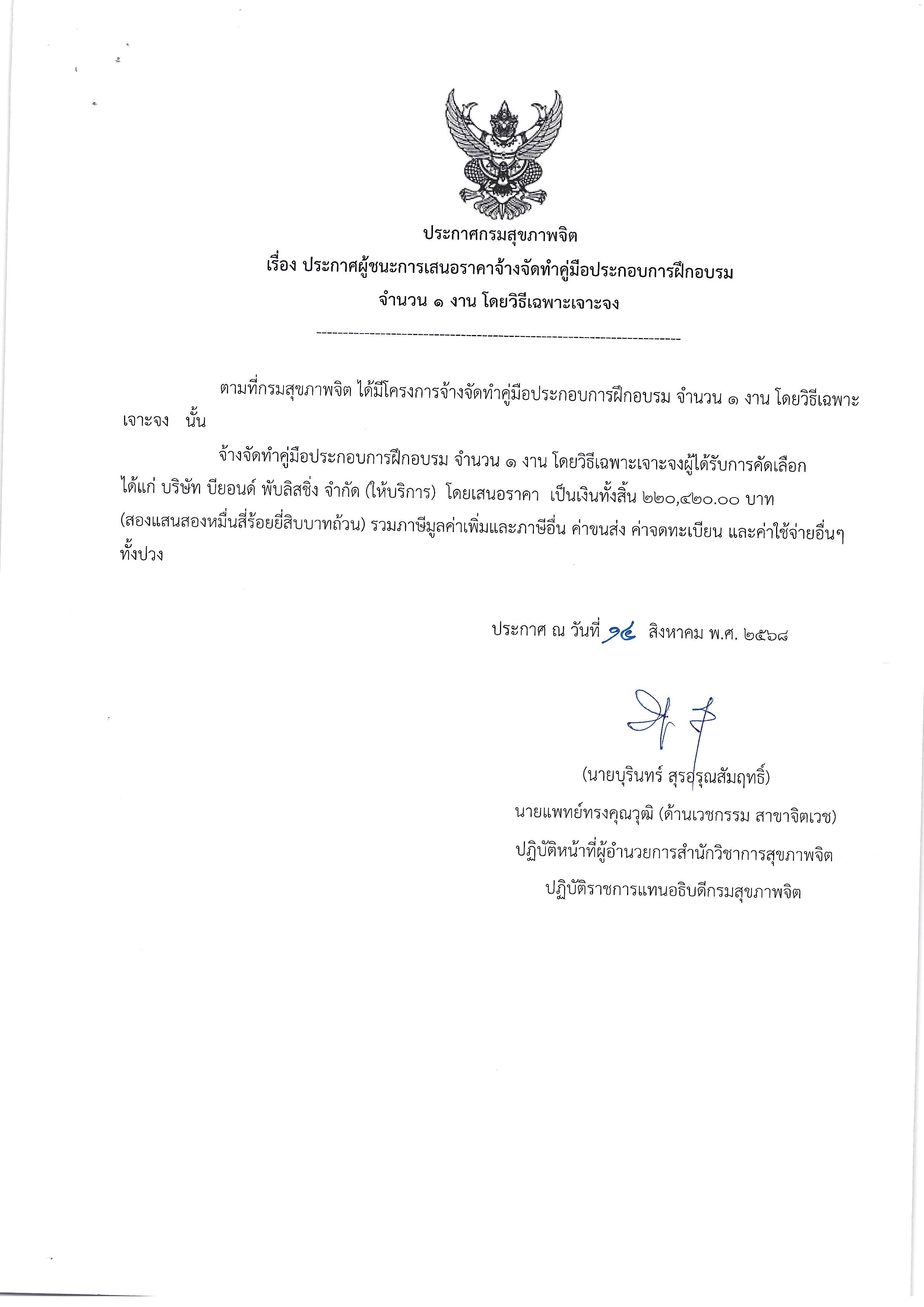 ประกาศผู้ชนะการเสนอราคาจ้างจัดทำคู่มือประกอบการฝึกอบรม จำนวน ๑ งาน โดยวิธีเฉพาะเจาะจง