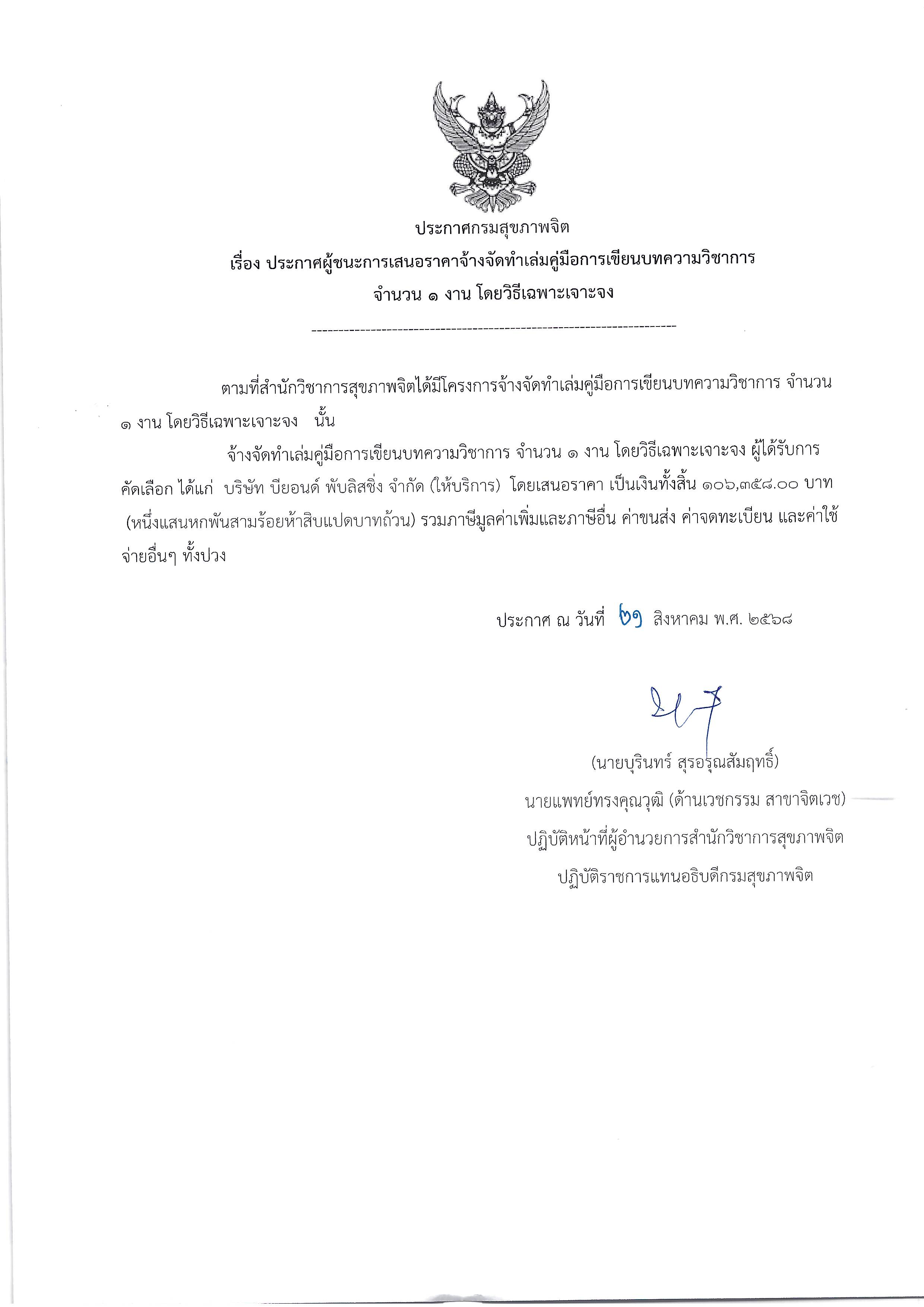 ประกาศผู้ชนะการเสนอราคาจ้างจัดทำเล่มคู่มือการเขียนบทความวิชาการ จำนวน 1 งาน โดยวิธีเฉพาะเจาะจง