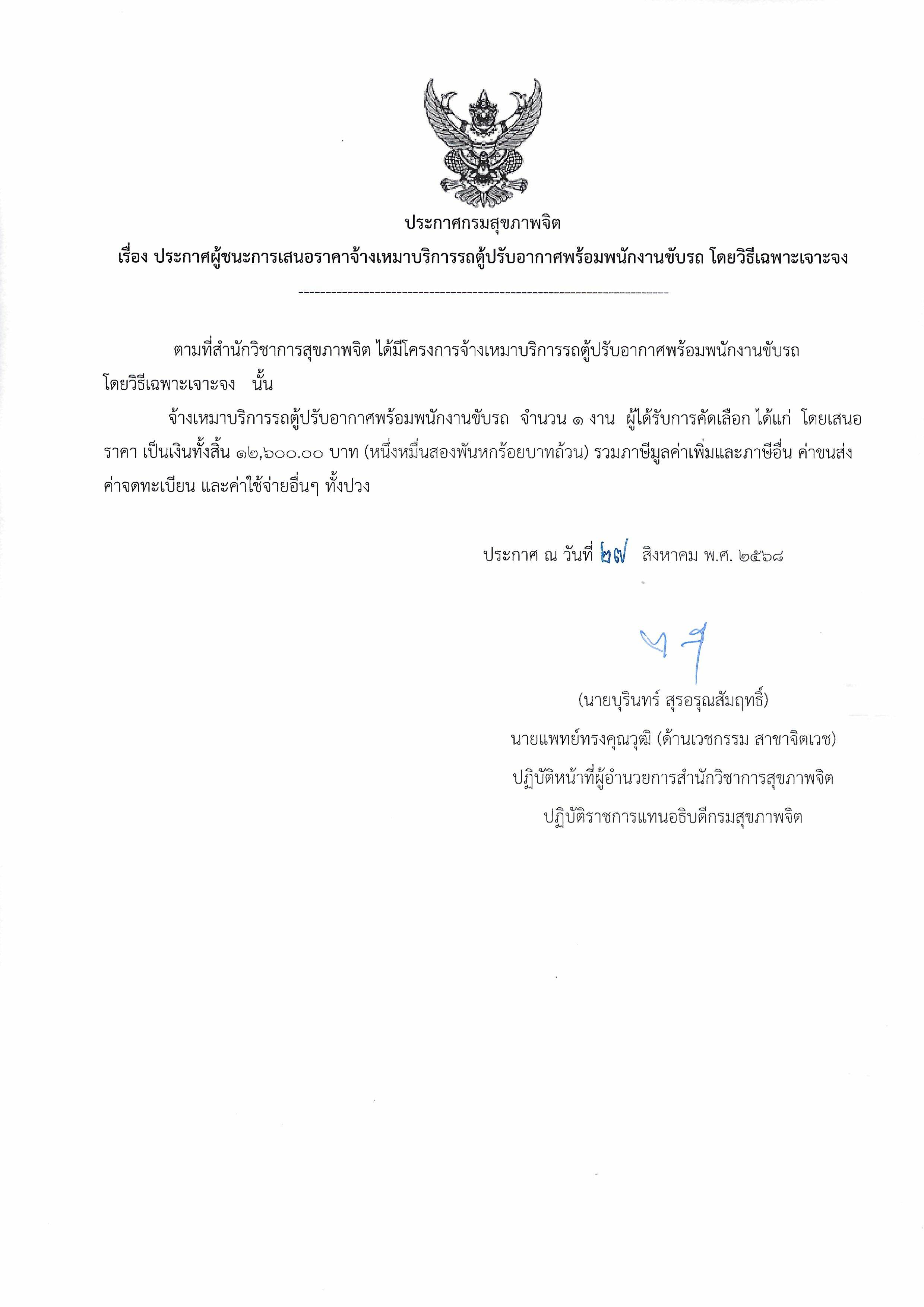ประกาศผู้ชนะการเสนอราคาจัดจ้างเหมาบริการรถตู้ปรับอากาศพร้อมพนักงานขับรถ โดยวิธีเฉพาะเจาะจง