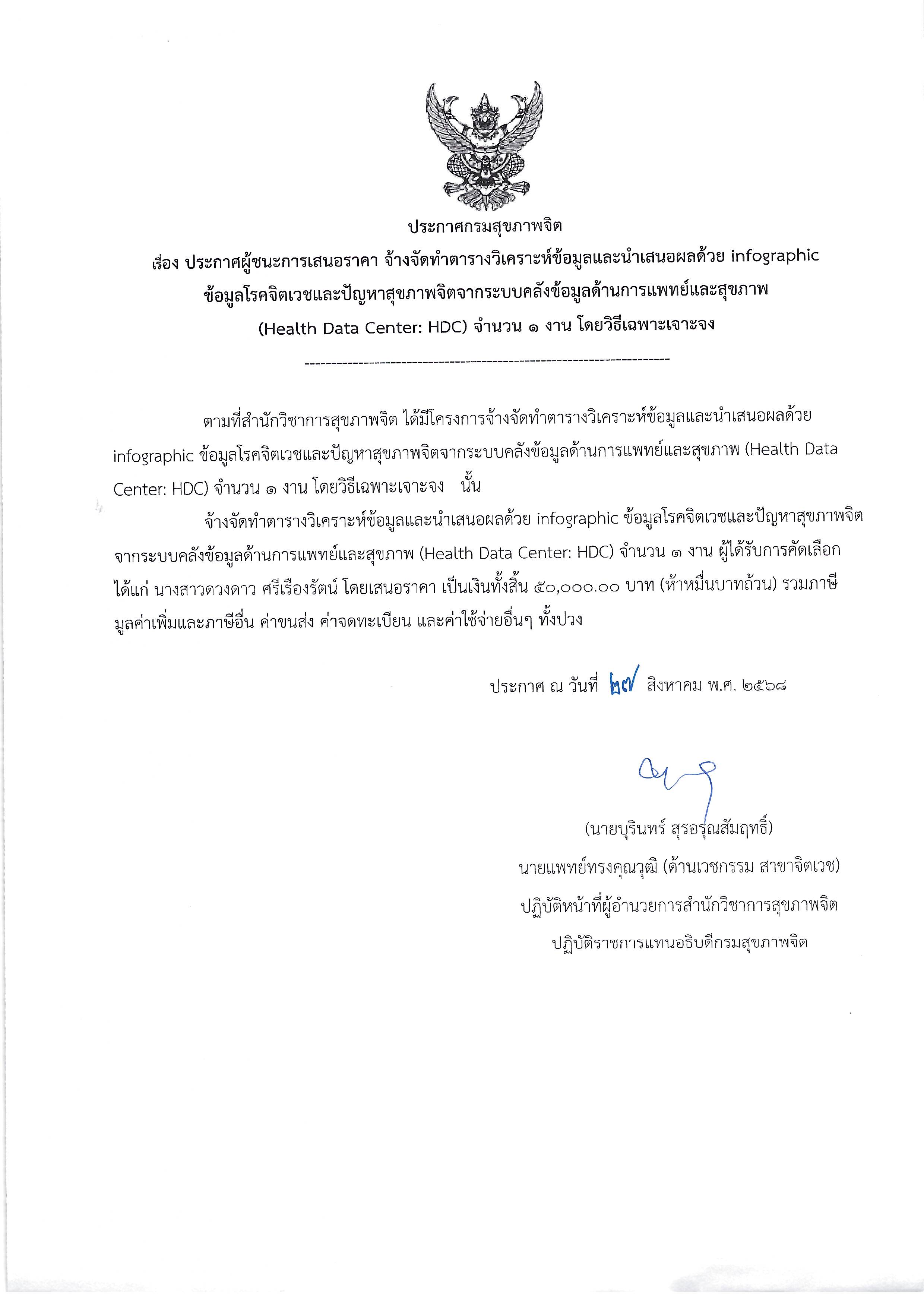 ประกาศผู้ชนะการเสนอราคาจ้างจัดทำตารางวิเคราะห์ข้อมูลและนำเสนอผลด้วย infographic ข้อมูลโรคจิตเวชและปัญหาสุขภาพจิตจากระบบคลังข้อมูลด้านการแพทย์และสุขภาพ (Health Data Center: HDC) จำนวน ๑ งาน โดยวิธีเฉพาะเจาะจง