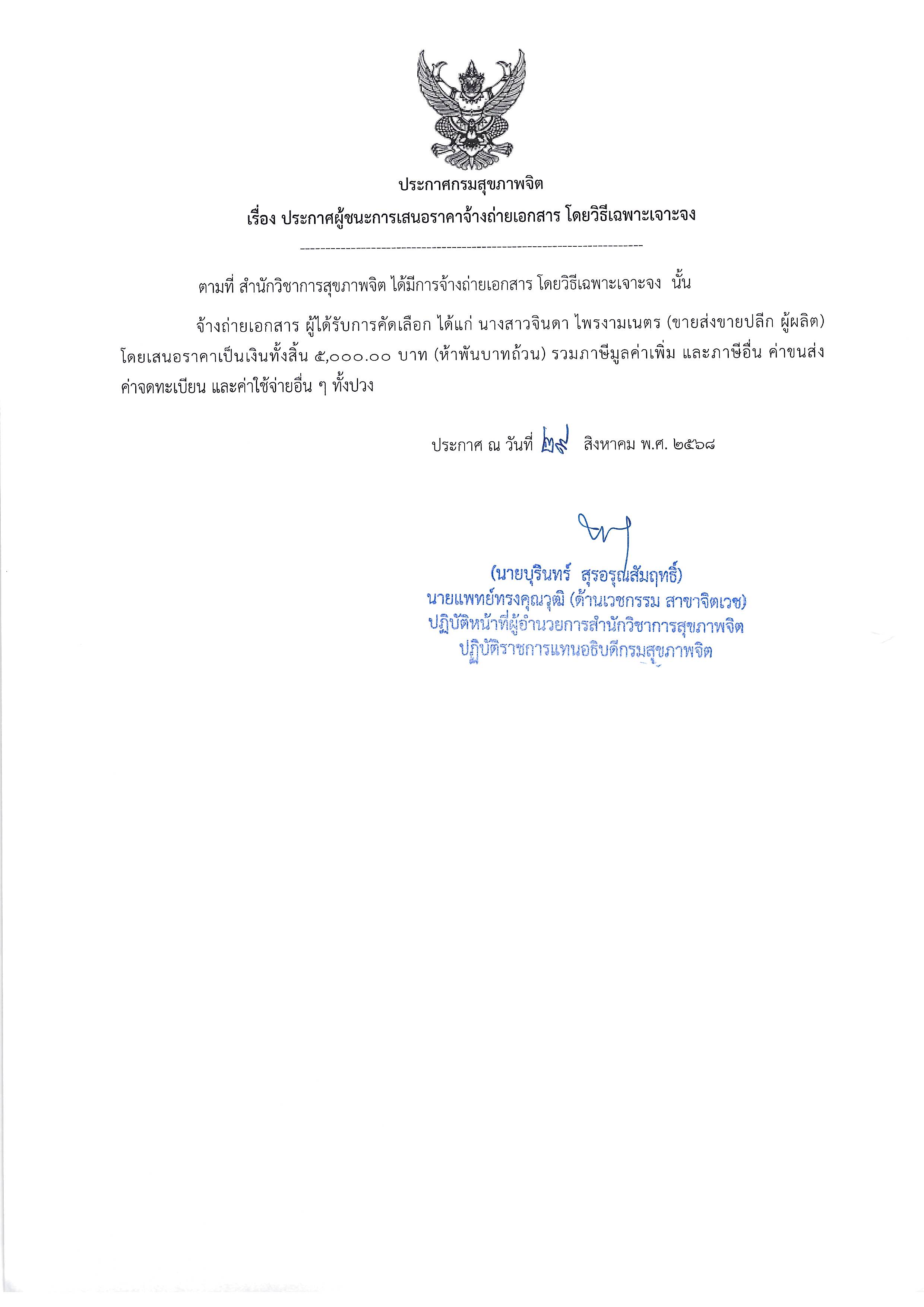 ประกาศผู้ชนะการเสนอราคาจัดจ้างถ่ายเอกสาร โดยวิธีเฉพาะเจาะจง