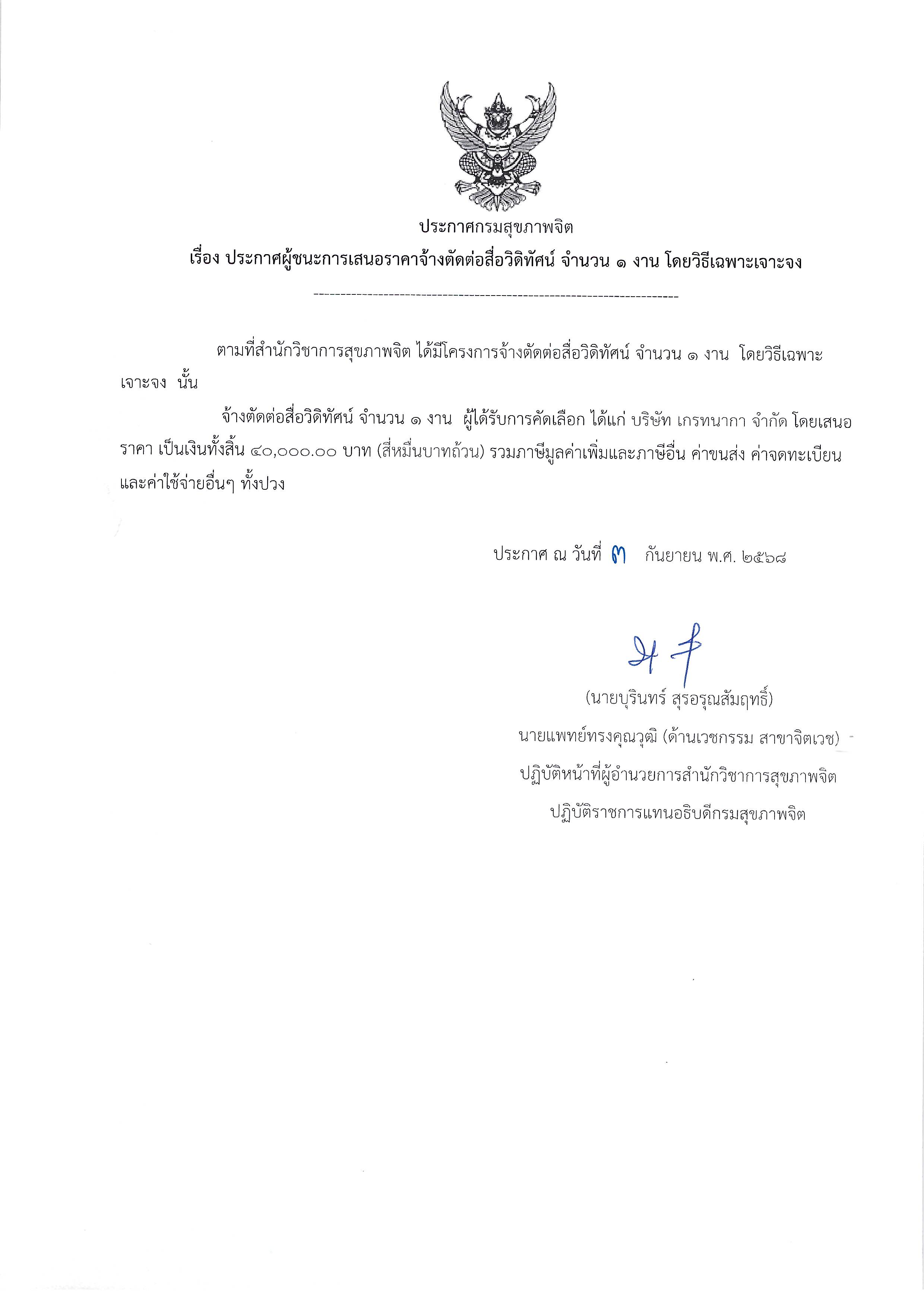 ประกาศผู้ชนะการเสนอราคาจ้างตัดต่อสื่อวิดิทัศน์ จำนวน ๑ งาน โดยวิธีเฉพาะเจาะจง