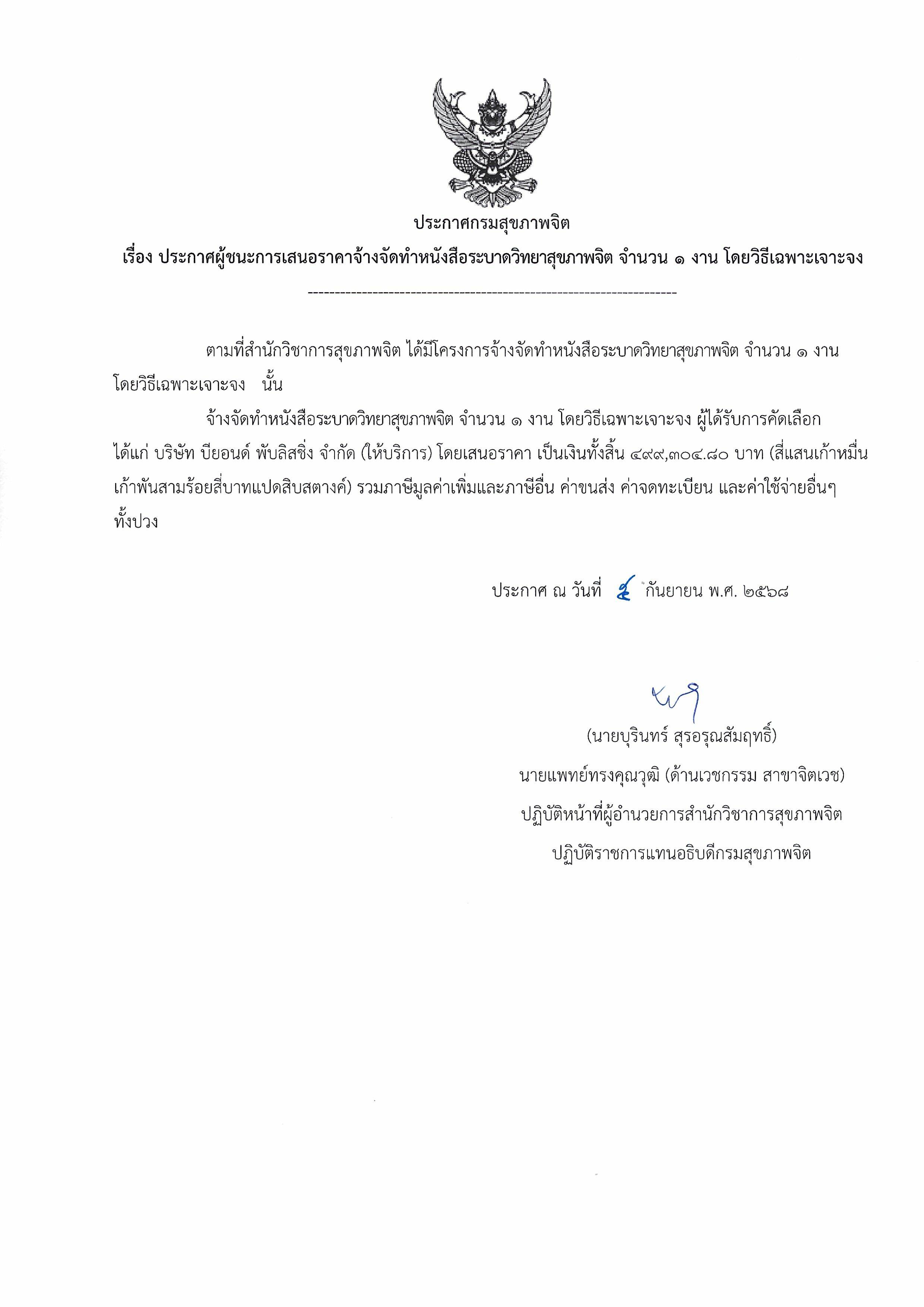 ประกาศผู้ชนะการเสนอราคาจ้างจัดทำหนังสือระบาดวิทยาสุขภาพจิต จำนวน ๑ งาน โดยวิธีเฉพาะเจาะจง