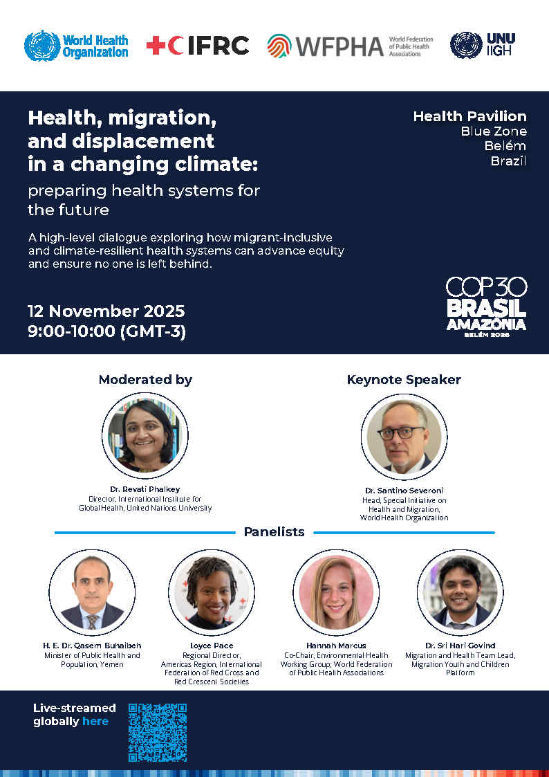รับชมสดทาง Live-streamed globally here: https://www.who.int/news-room/events/detail/2025/11/12/default-calendar/cop30-high-level-event--health--migration-and-displacement-in-a-changing-climate
