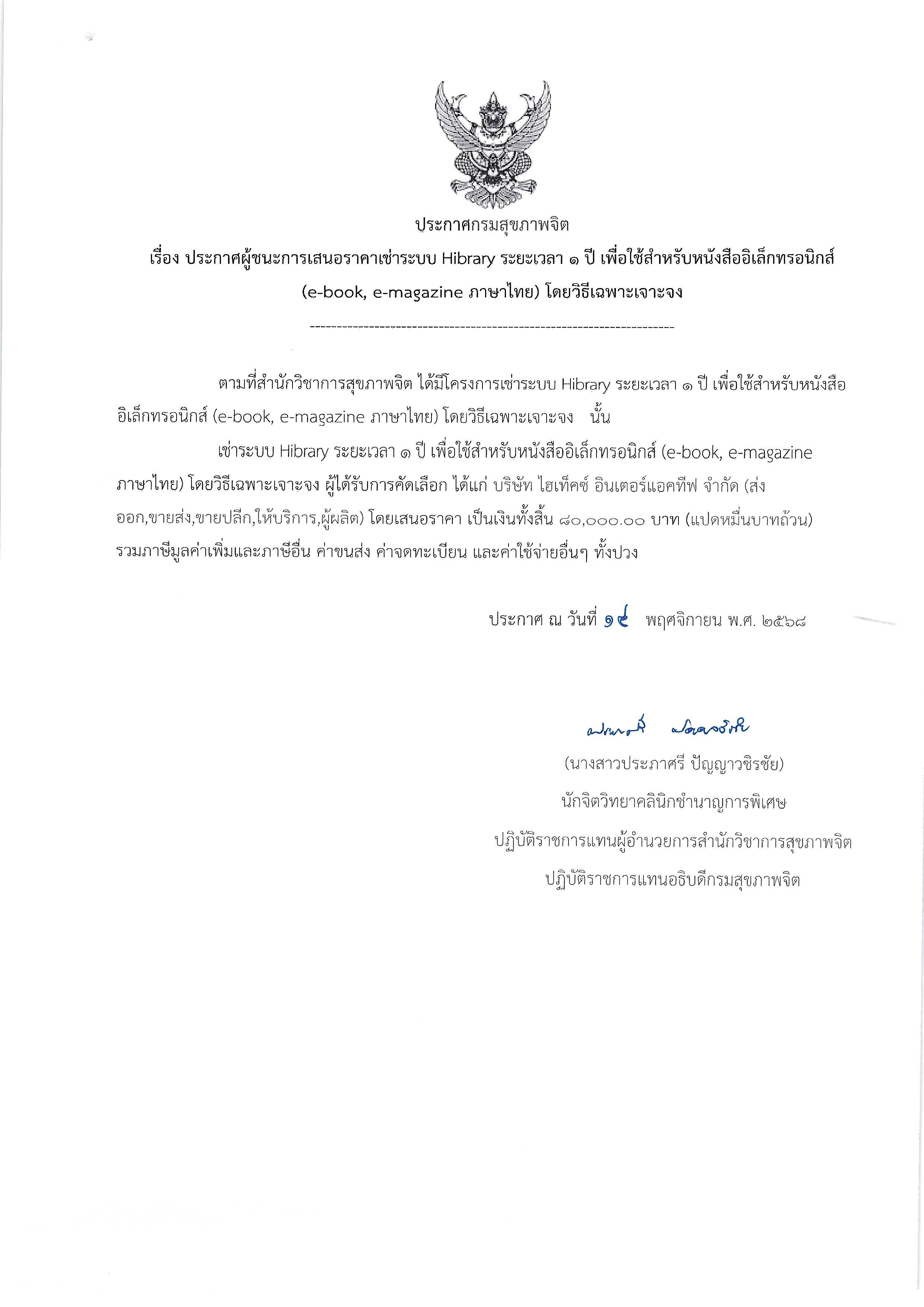 ประกาศผู้ชนะการเสนอราคาเช่าระบบ Hibrary ระยะเวลา 1 ปี เพื่อใช้สำหรับหนังสืออิเล็กทรอนิกส์ (e-book, e-magazine,ภาษาไทย) โดยวิธีเฉพาะเจาะจง