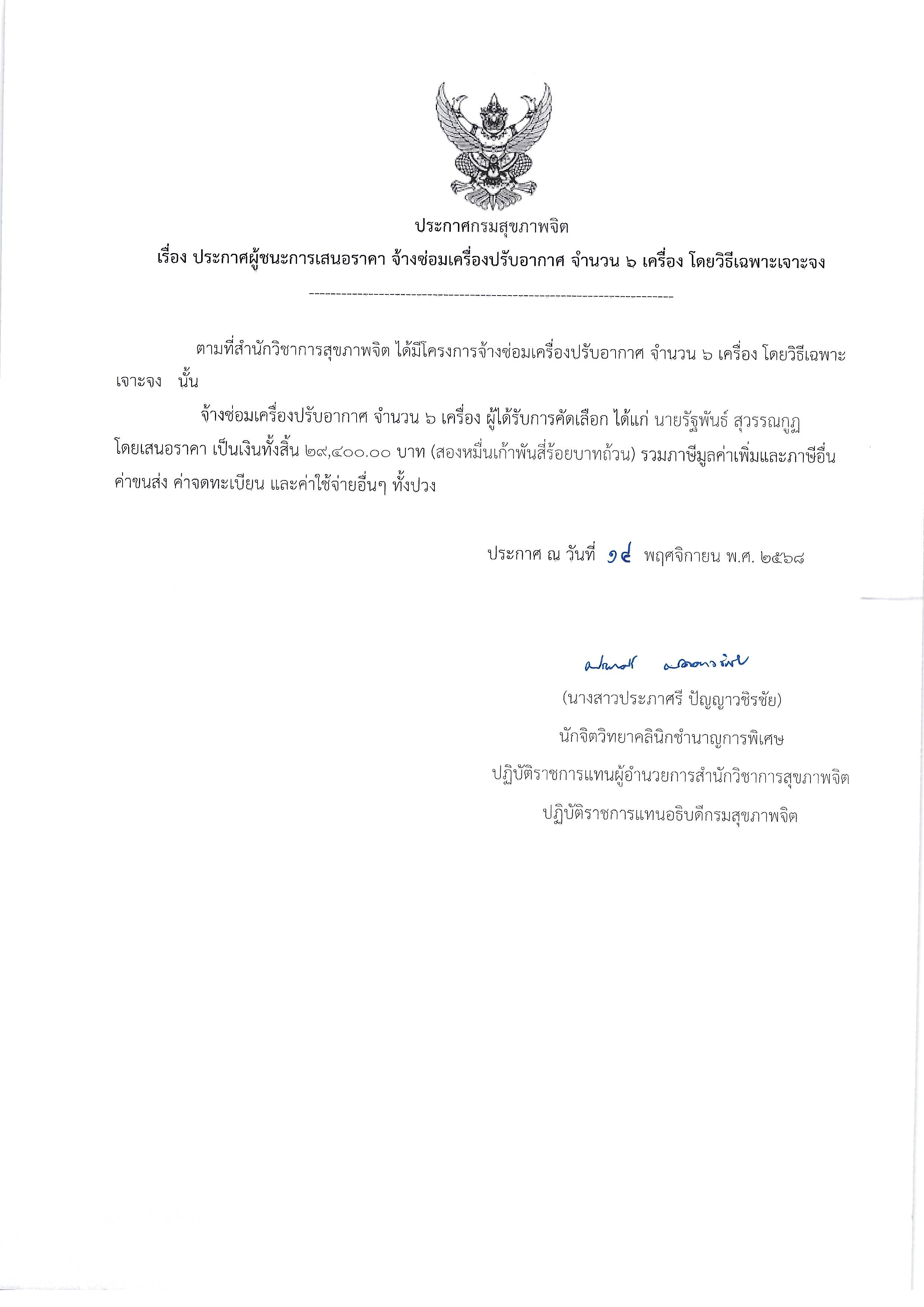 ประกาศผู้ชนะการเสนอราคาจ้างซ่อมเครื่องปรับอากาศ จำนวน 6 เครื่อง โดยวิธีเฉพาะเจาะจง